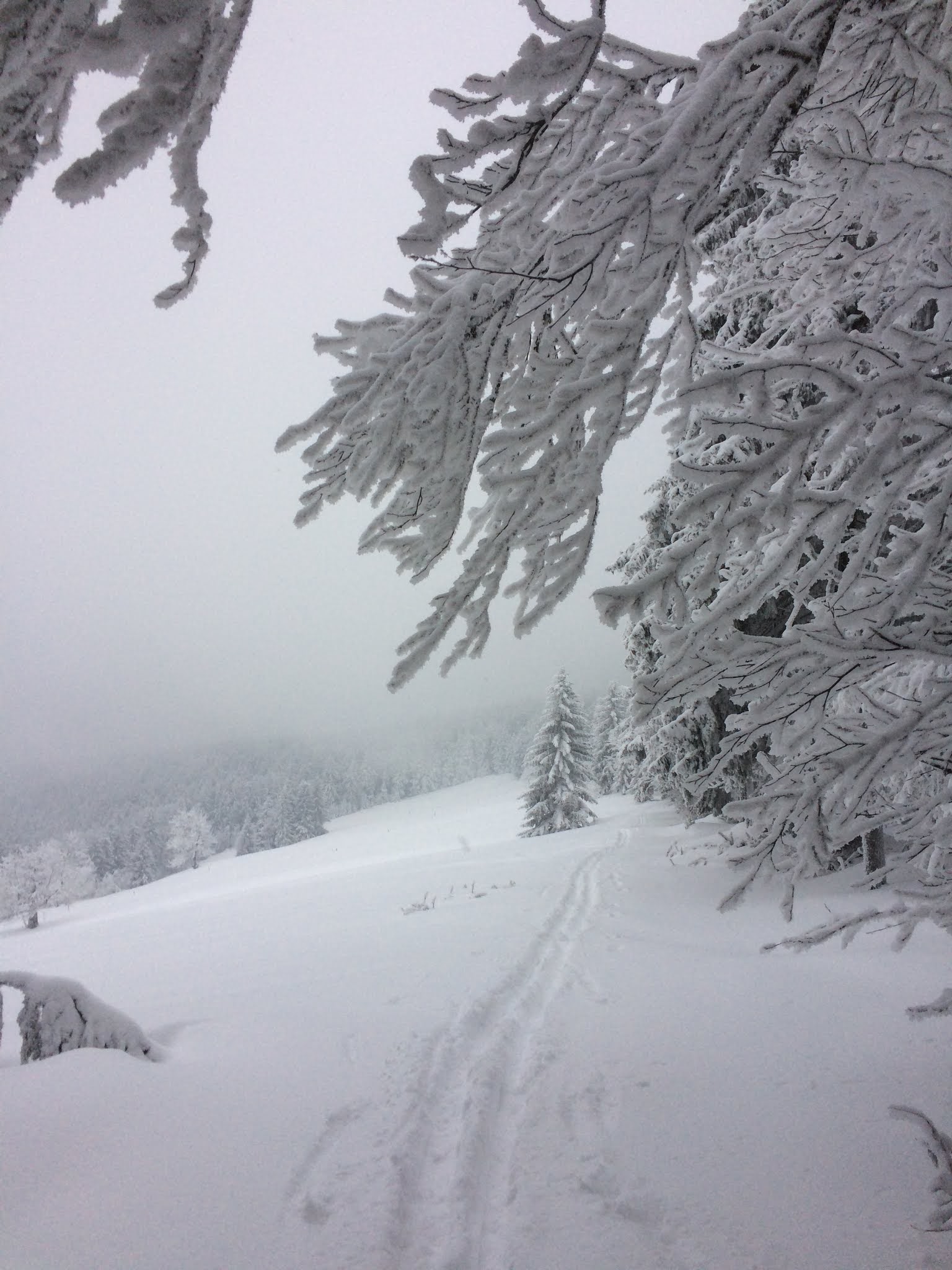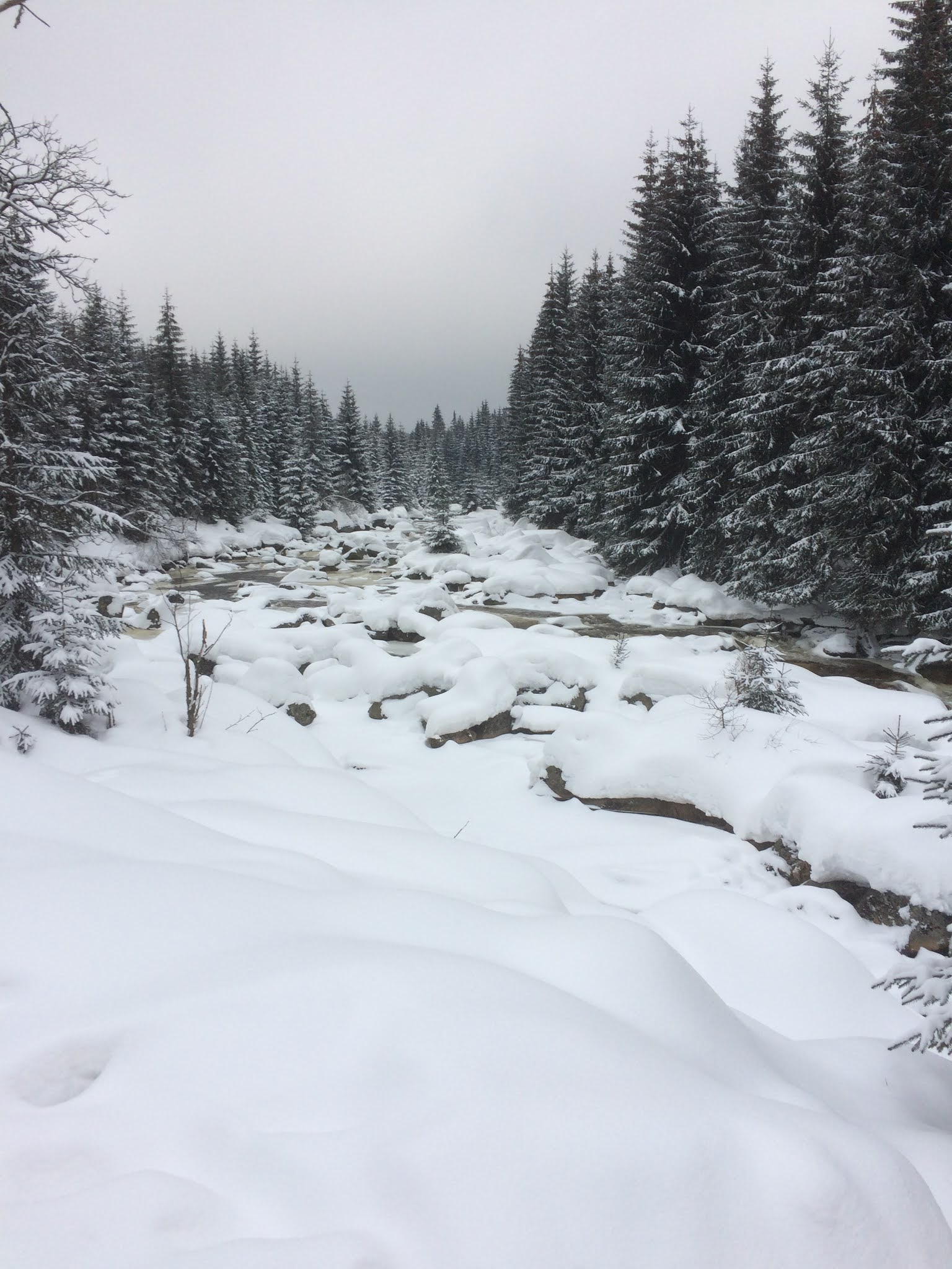 Jizerské hory dostály své pověsti a až na Jizerku byla trasa rolbou upravená. Ne, že by se jednalo o nějaký dlouhý skluz, na to mé šupinky na lyžích byly moc šupinaté a saně tupé, ale příjemně a rychle to utíkalo. Z Jizerky jsem již hlubokým sněhem ilegálně sjel k našim sousedům do Polska, abych si zkrátil cestu do Harrachova.