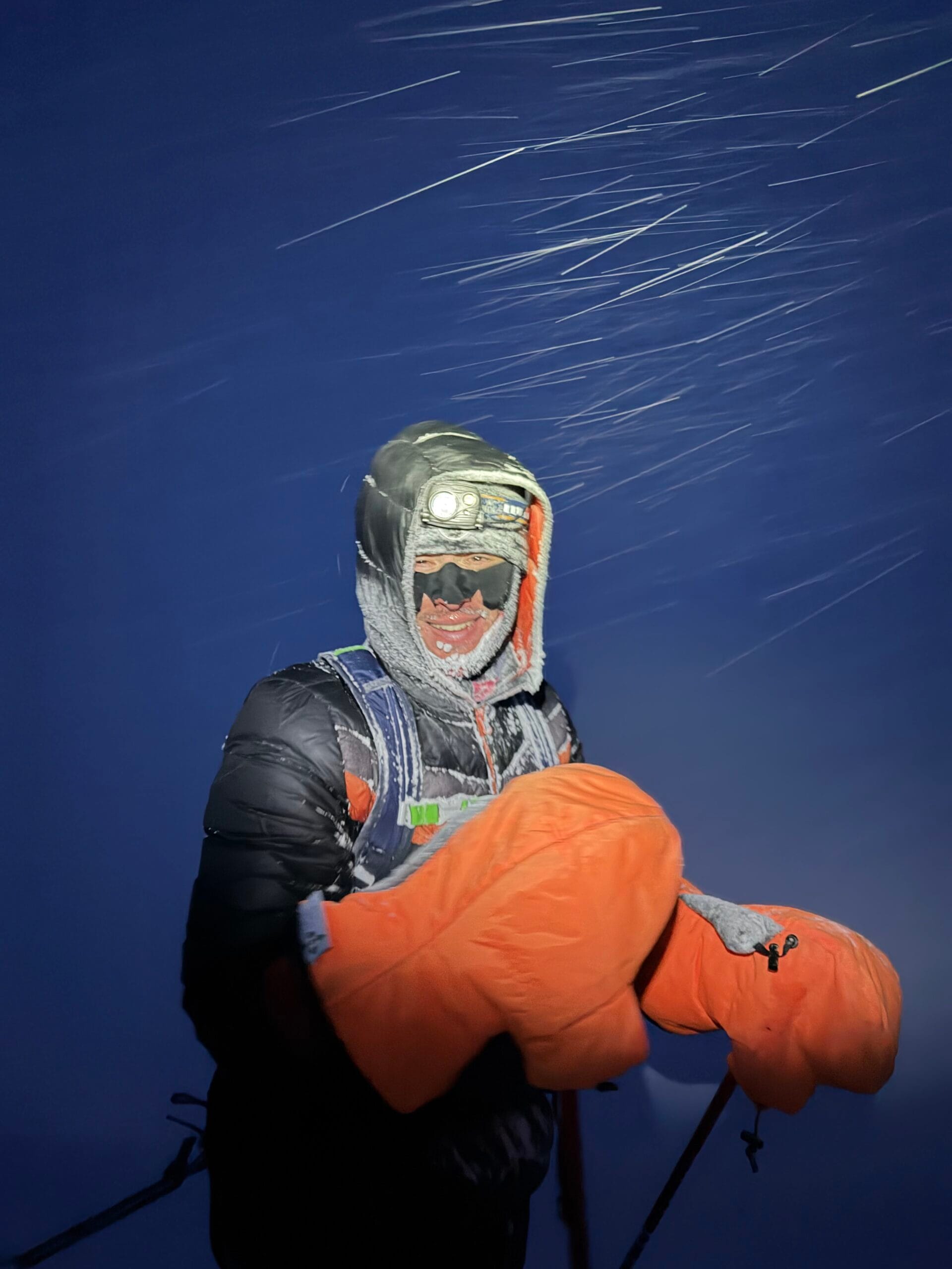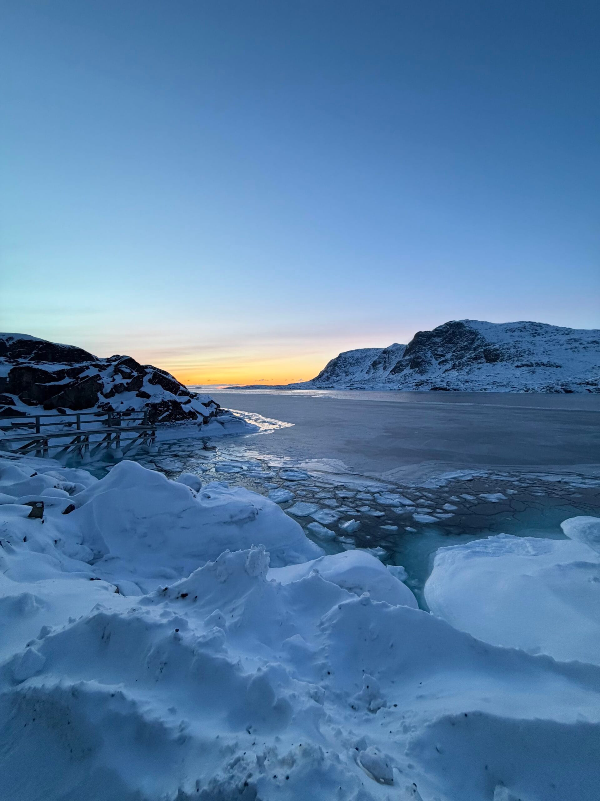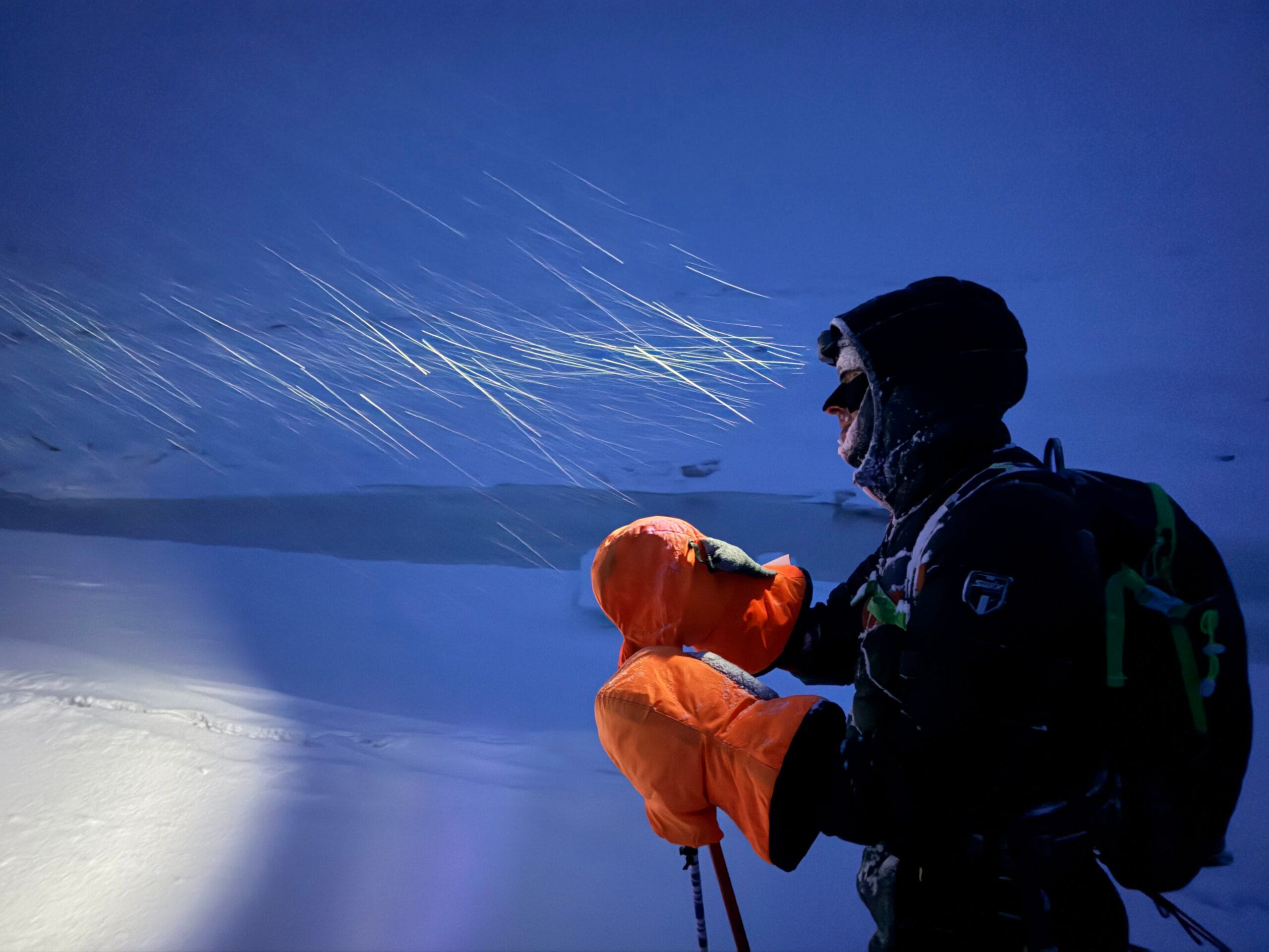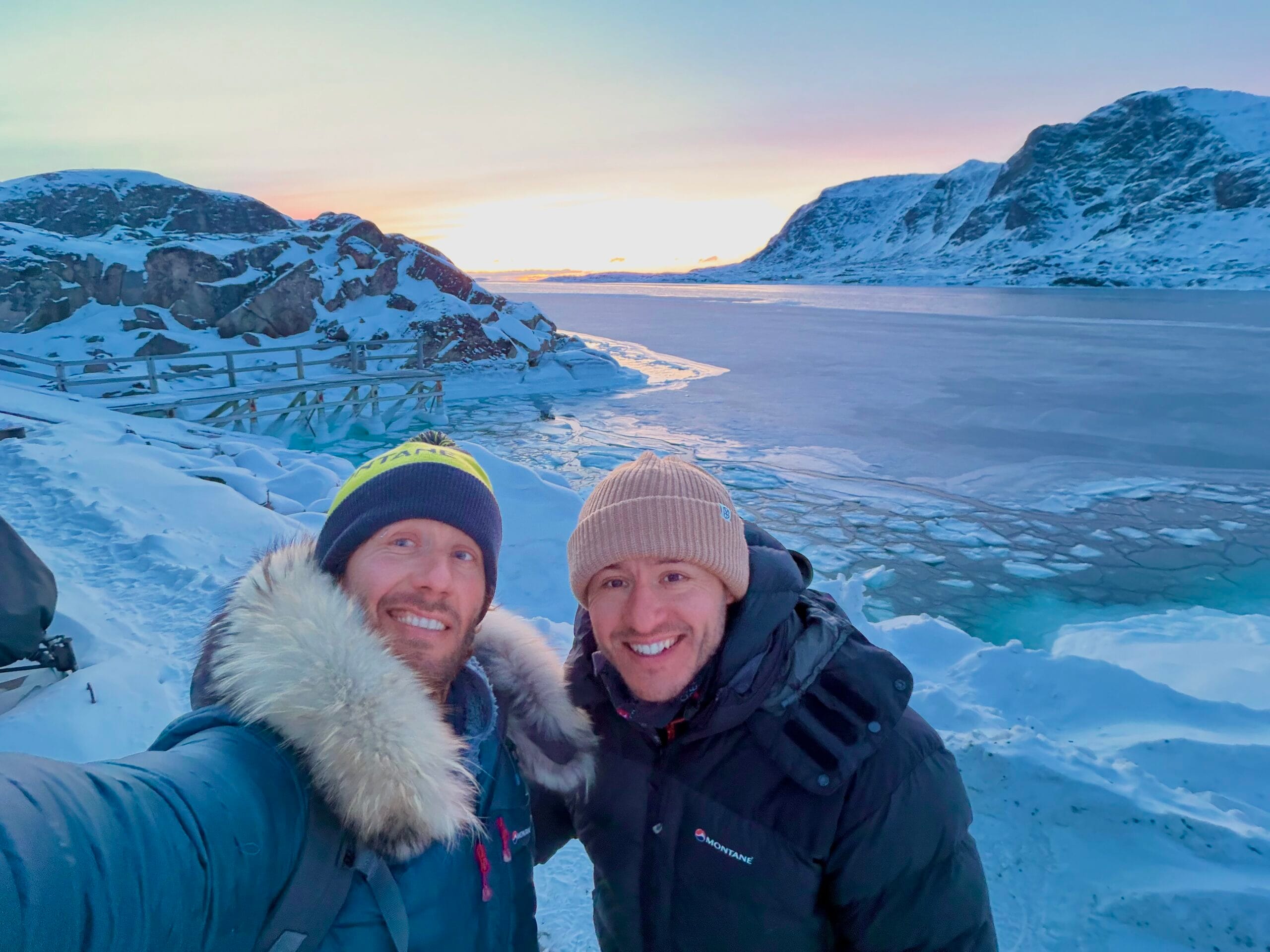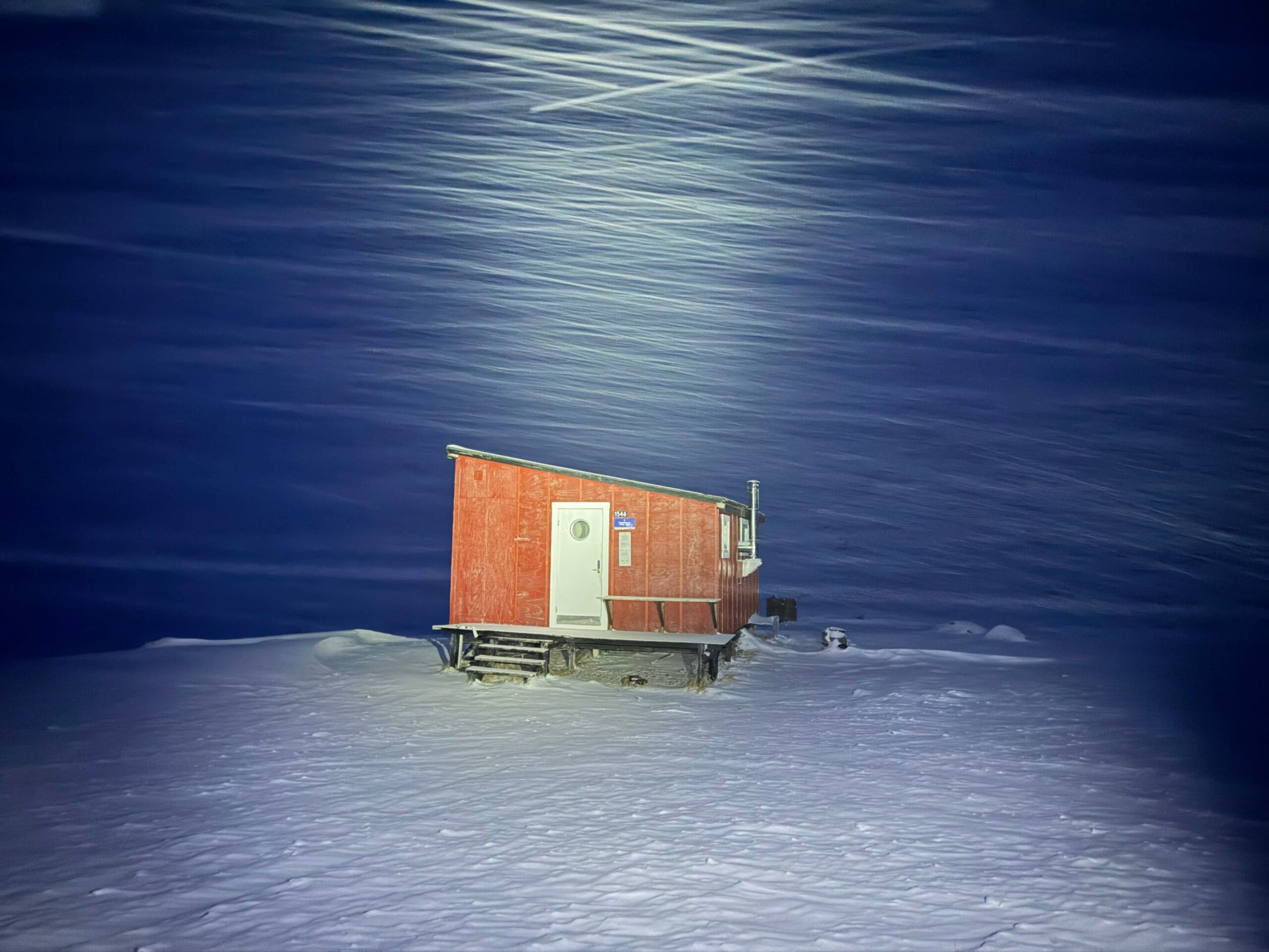 Fjord byl čerstvě zamrzlý a u břehu prosakovala voda, nicméně ve sněhu byla znát zafoukaná stopa skútru a těch Amíků. S lehkou nervozitou jsme se vydali na fjord. To už jsme museli tahat čelovky, sněžilo, křupalo to jak v reklamě na Tatranku a na chatu jsme dorazili za úplné tmy v deset večer znatelně vyčerpaní, ale šťastní. Teploměr ukazoval -31 °C, a tak jsme se hned jali zprovoznit kamna. Ale nějak se nám to nedařilo a to jsme začali být trochu smutní. Naštěstí díky naší šikovnosti jsme nakonec tryskou petrolej prohnali a kamna zapálili. To bylo radosti. A taky půl jedné ráno. Krásnej západ Slunce z chaty to byl.