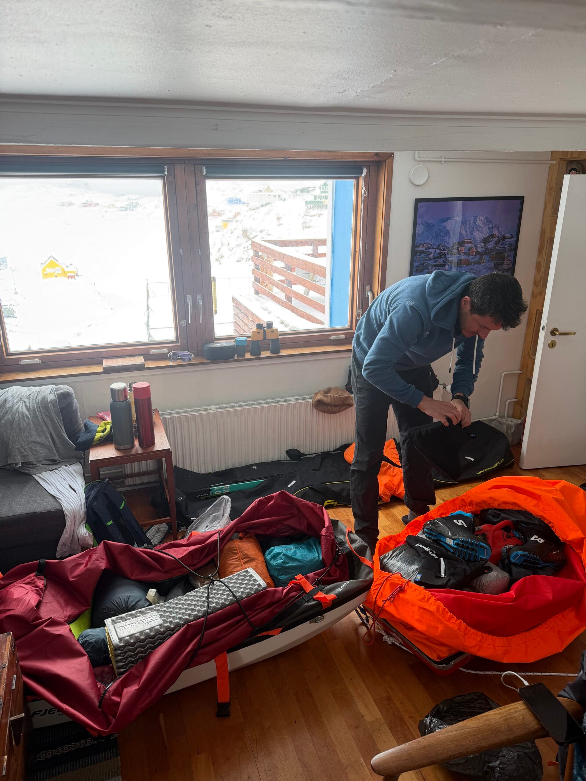 Jen tak tak jsme všechny ty Montane, Thermarest, MSR a Sea to Summit věci sbalili do tašky a do toho ještě několik párů Kastle prken různých druhů a karbonových tyček Haakon. Odletěli jsme a měli jsme kliku, že jsme i doletěli zhruba podle leteckého řádu, což se při letech do Grónska, zejména přes hlavní město Nuuk, moc často nestává. Přes něj jsme naštěstí neletěli. V Kangerlussuaqu, kde jsme měli mezipřistání, nám vyrazila dech nepřítomnost sněhu. V Sisimiutu už to bylo lepší, ale dalo se to počítat v centimetrech. Podle místních jedna z nejhorších zim. Možná za to může rozpálení z rozhořčení místních kvůli nedávným divokým americkým vodám, které naštěstí zase zamrzají a zamrzlé doufejme už zůstanou.