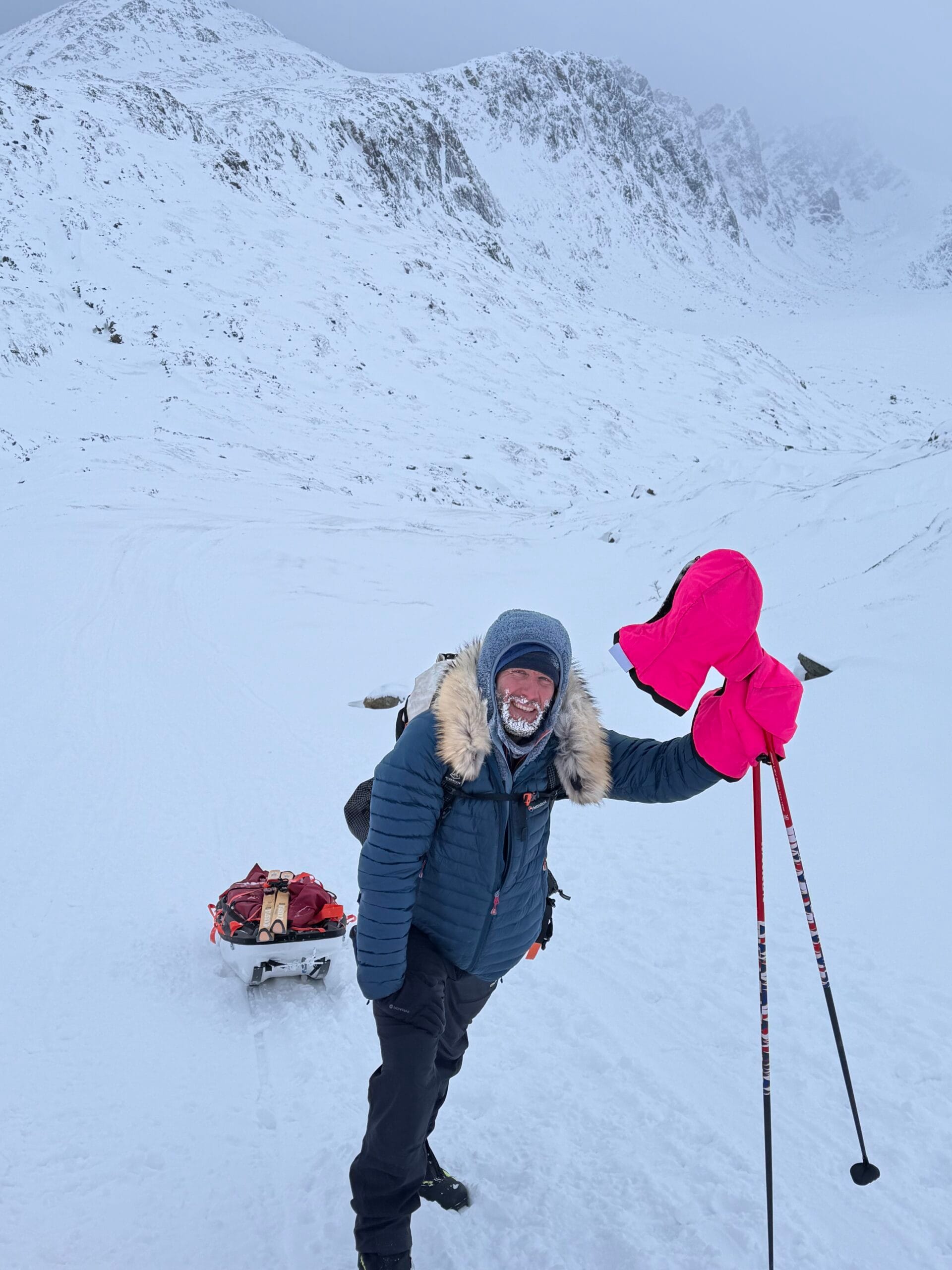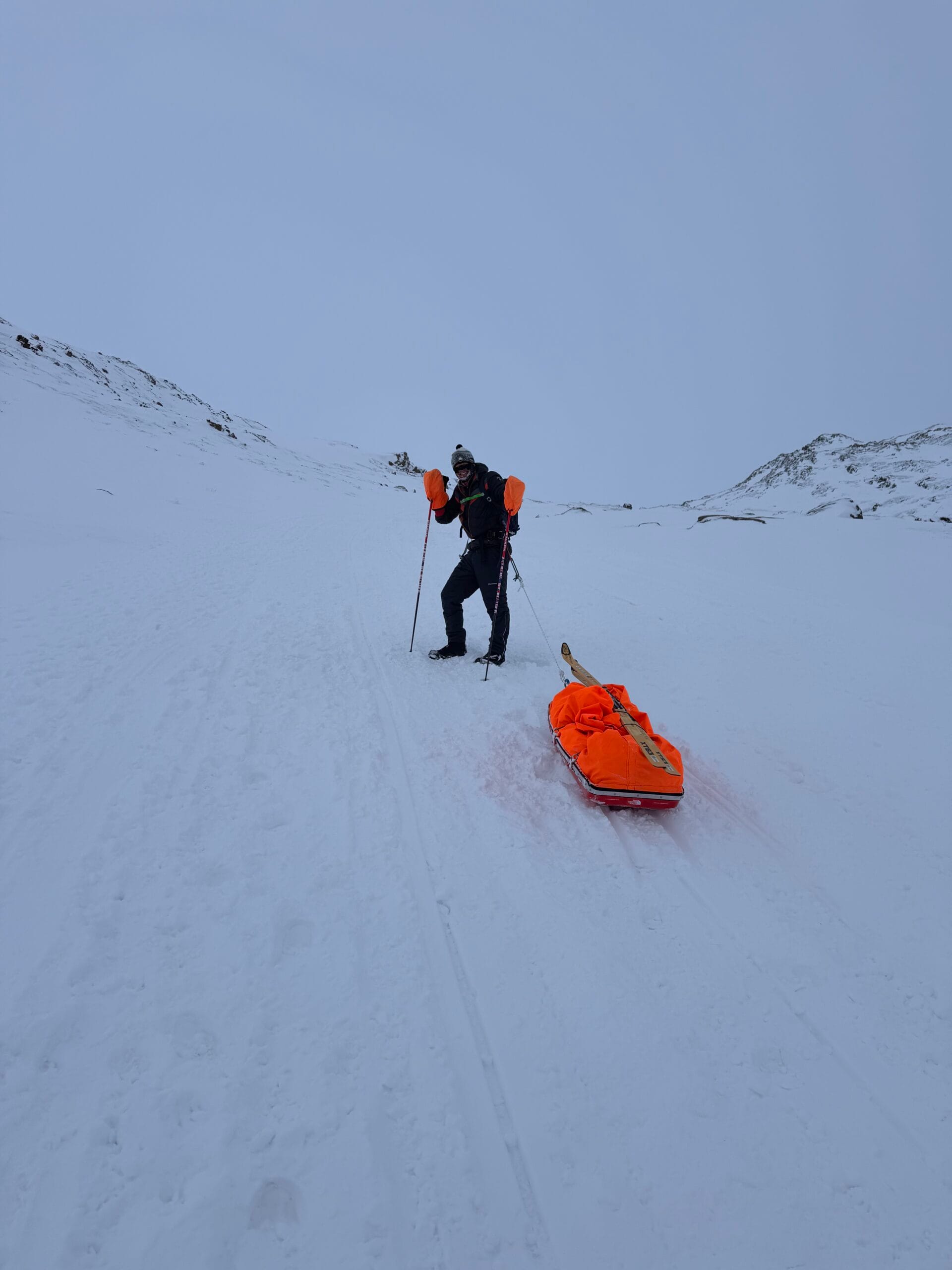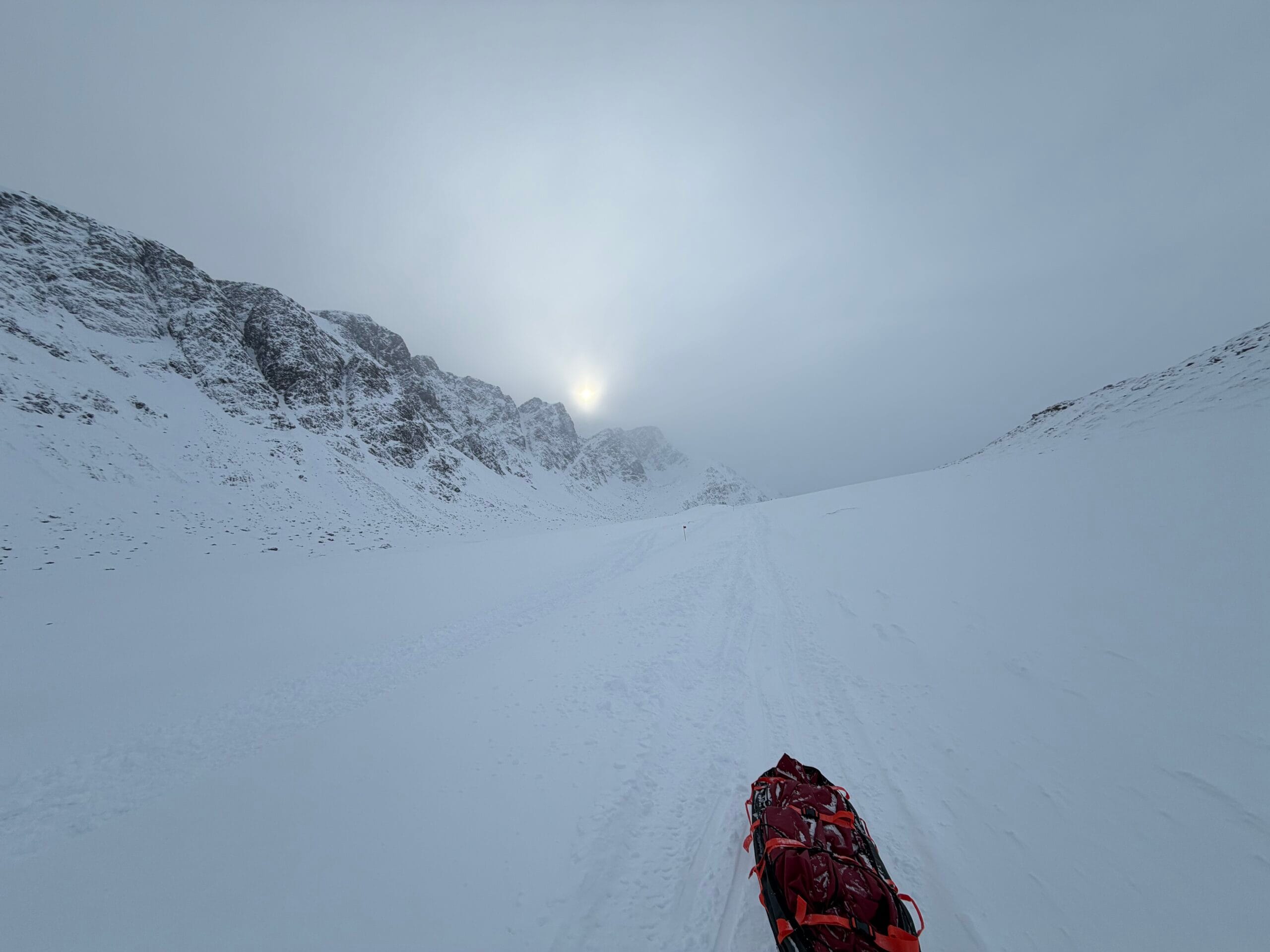 Chtěli jsme začít zvolna a na první chatku to bylo pouhých 24 km. Vyhodnotili jsme, že stačí vyjít odpoledne, abychom se kochali západem Slunce už z chaty. Navíc venku stále od večera řádila pořádná vichřice se sněžením a teploty byly dost nízko, a tak jsme se ven nehnali. Když jsme tedy konečně opustili pohodlí domova, přišla srážka s realitou. Ty vrstevnice na mapě vůbec nevypadaly tak nahuštěné na sebe jako v reálu. Ten sníh zpoza okna nevypadal tak přemrzlý. Tahat po něm těžké sáně na lyžích ustanovilo průměrnou rychlost 3 km/hod. Ale zatím jsme měli sílu a elán. Vichřice polevuje a začínáme vidět okolo sebe. To sedlo nahoře tam v nebi musí být nejvyšší bod. Čím blíže jsme se škrábali, tím více jsme viděli, že to sedlo nebude jediné a hlavně nebude nejvyšší. Nevadí, dobrej trénink a ty hory, co jsou v tom počasí vidět, jsou nádherný. Kopce jsou tak prudký, že musíme sundávat často lyže a jít pěšky.